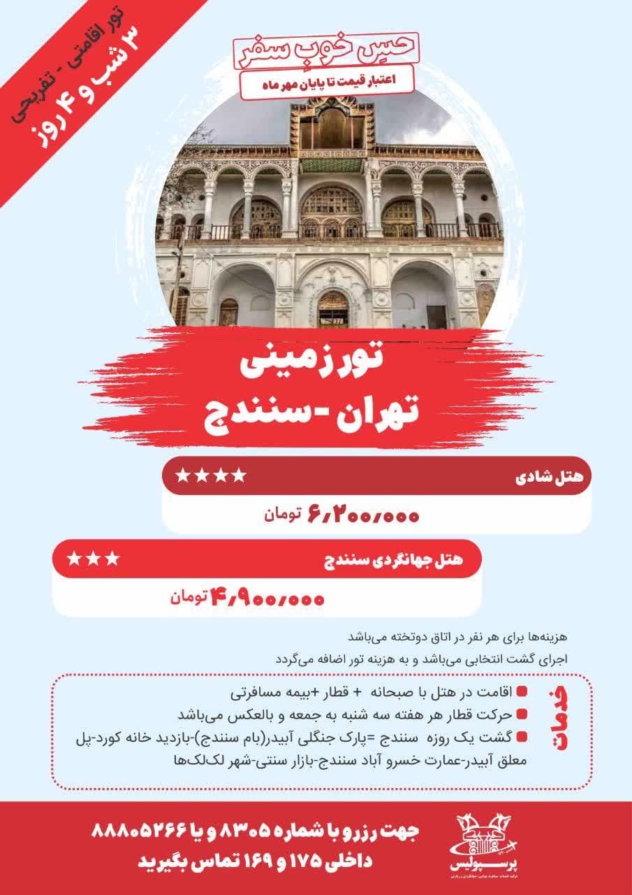 صفحه اصلی تورها تورهای داخلی تور سنندج تور ریلی سنندجSanandaj مدت اقامت از سه شب و چهار روز شروع قیمت از ۴,۹۰۰,۰۰۰ تومان هتلها پکیج تور تور سنندج مهر 1403 شهرهای مورد بازدید سنندج کشورهای مورد بازدید ایران خدمات تور بلیط رفت و برگشت اقامت در هتل بیمه مسافرتی جزئیات تور شهر مبدأ: تهران محل حرکت تور: راه آهن تهران درجه سختی: متوسط هتلها هتل شادی سنندج سنندج / ایران موارد بیشتر